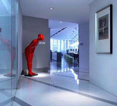 創(chuàng)意辦公室設(shè)計主要的是與眾不同的體現(xiàn),進入辦公室給人一種眼前一亮的感覺??紤]到陽光朝向?qū)k公環(huán)境的影響,室內(nèi)桌子和電腦顯示器遮蔽在靠南的陰影下,另一側(cè)的墻壁擺放各種物件,亂中有序。南寧創(chuàng)意辦公室設(shè)計裝修,南寧創(chuàng)意辦公室設(shè)計的設(shè)計師特別通過色彩對透明開放和封閉的兩部分進行對比,室內(nèi)搭配明快的顏色,白色、紅色、綠色裝飾物,與室內(nèi)墻面和地面灰白色形成強烈的對比,顯得跳躍,生機勃勃。